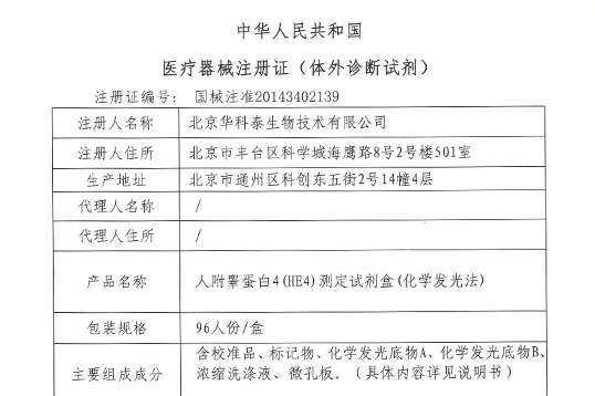 取得肿瘤标志物新HE4注册证,肿瘤检测菜单15项;